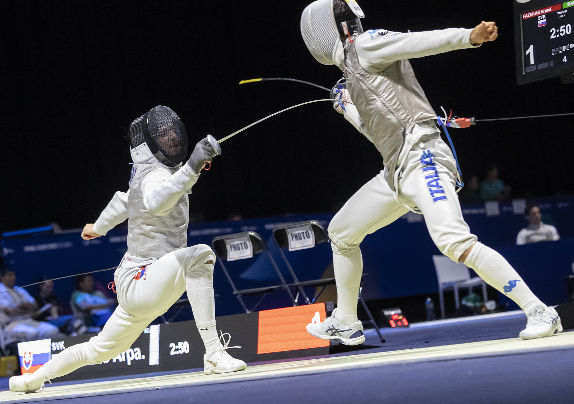 Na šermiarske planše vo veľtržnej hale Messe Essen nastúpilo trio slovenských fleretistov Árpád Fazekas, Leopold-Marc Kuchta a Zoltán Sármány. Do 64-členného pavúka vyraďovacích súbojov postúpil s piatim víťazstvami Árpád Fazekas, ktorého v kvalifikačných pooloch dokázal poraziť iba Kórejčan Hyeseong a Leopold-Marc Kuchta s tromi víťazstvami a tromi prehrami. Nešťastný los v prvom kole pridelil Árpádovi Fazekasovi silného súpera Hongkongčana Maka, s ktorým v piatich vzájomných súbojoch ešte nevyhral a psychika zohrala svoje. Árpád sa v prvej polovici držal na dosah so skóre 4:5, no v druhej časti získal Mak štyri body v rade a napriek bojovnému výkonu mu Fazekas podľahol 12:15. „Začiatok bol veľmi dobrý. Podarilo sa mi zdolať naozaj dobrých a vysoko nasadených šermiarov. Asi najlepší zápas, ktorý som šermoval bol proti Talianovi Martinimu, ktorý je nasadený ako dvojka turnaja a víťazstvo nad ním pred mňa znamená veľmi veľa. V eliminačnej časti som nečakal, že dostanem hneď ťažkého súpera v podobe jedného z najlepších hongkonských šermiarov. Prehral som 12:15, čo nie je zlé, ale musím sa do budúcna pripraviť mentálne lepšie,“ zhodnotil po súboji študent Slovenskej zdravotníckej univerzity Fazekas.