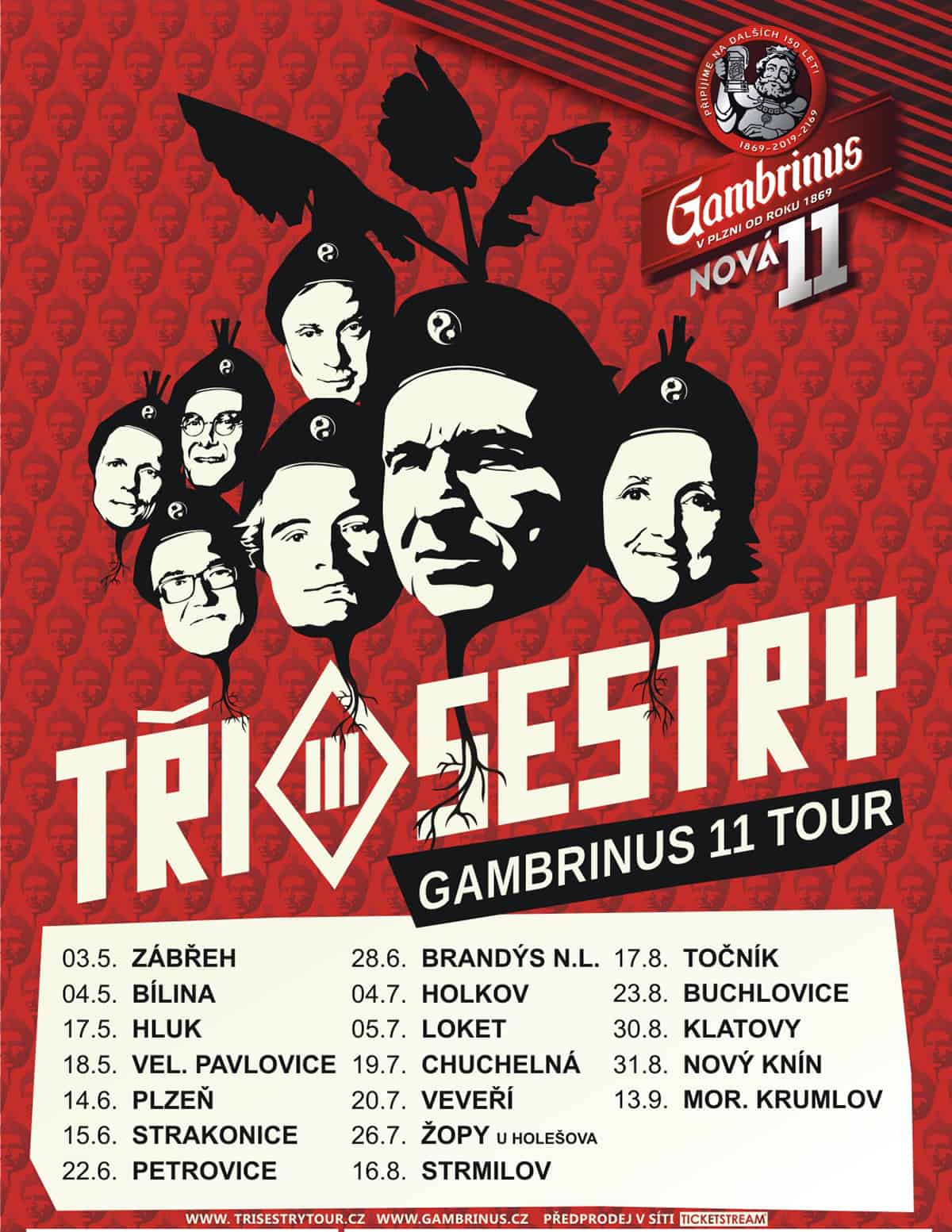 V rámci Tři sestry Gambrinus 11 tour 2019 s sebou kapela přiveze i velkolepou pódiovou show a zcela nový playlist, v němž představí také písně z nového alba ¡Svobodu ředkvičkám!. V areálech nebude chybět ani čepované pivo Gambrinus 11 a putovní výčep, který bude ku prospěchu kapely a fanoušků v prvních řadách umístěn přímo na pódiu. Role předskokana se zhostila budějovická kapela Pirates of the Pubs, již vybrala skupina ve spolupráci s OSA. Kapela se tak rozhodla dát šanci mladým talentům. „Líbí se nám jejich nekomplikovaný vztah k životu, hudbě a zábavě ve všech formách! Budete je s námi vídat tedy po celé krásné léto 2019. Na druhém místě se umístila skupina Velký Voči a třetí jsou Curlies. I tyhle kapely jistojistě na našich akcích uvidíte!“ uvedla kapela Tři Sestry.