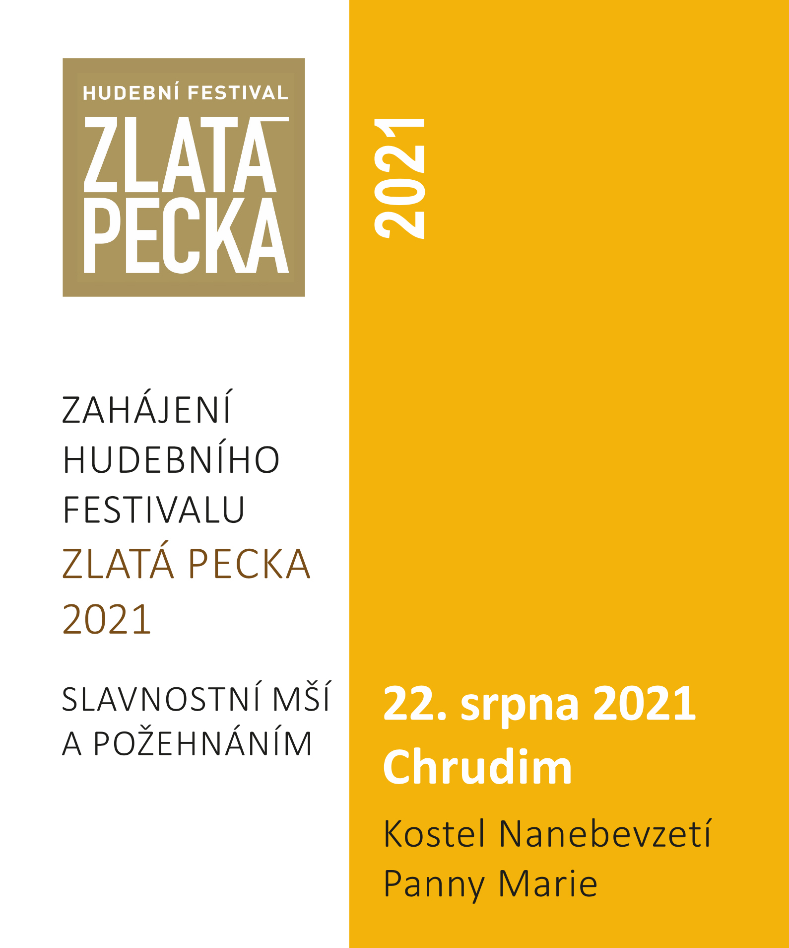 Hudební festival Zlatá Pecka, který je letos věnován operní pěvkyni řeckého původu Marii Callas, bude zahájen slavnostní mší v Kostele Nanebevzetí Panny Marie v Chrudimi v neděli 22. 8. v 11:00 hodin. Během obřadu zazní skladba Gioachino Rossiniho „Petite messe solennelle” v provedení špičkových českých interpretů Kristýny Vylíčilové, Davida Nykla, Daniela Matouška a Pavly Mlčákové.