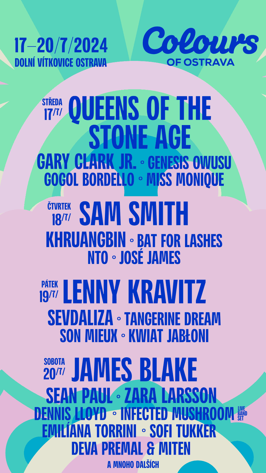 Colours of Ostrava aj tento rok ponúka výber toho najlepšieho zo svetovej hudobnej a kultúrnej scény. Na tohtoročnom festivale sa predstavia Sam Smith, americkí rockeri Queens of the Stone Age, či nestarnúca rocková legenda Lenny Kravitz. Ďalšími hviezdami sú spevák a producent elektronickej hudby James Blake, jamajský veterán Sean Paul, severská popová diva Zara Larsson, štýlové multižánrové trio Khruangbin z Texasu, éterický hudobník Bat for Lashes, bluesový gitarista Gary Clark Jr., Sevdaliza a mnohí ďalší.