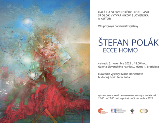Galéria Slovenského rozhlasu v spolupráci so Spolkom výtvarníkov Slovenska pozýva verejnosť aj médiá na otvorenie výstavy Štefana Poláka – ECCE HOMO. Vernisáž sa uskutoční v stredu 5. novembra 2025 o 18:00 v Galérii Slovenského rozhlasu, Mýtna 1, Bratislava.